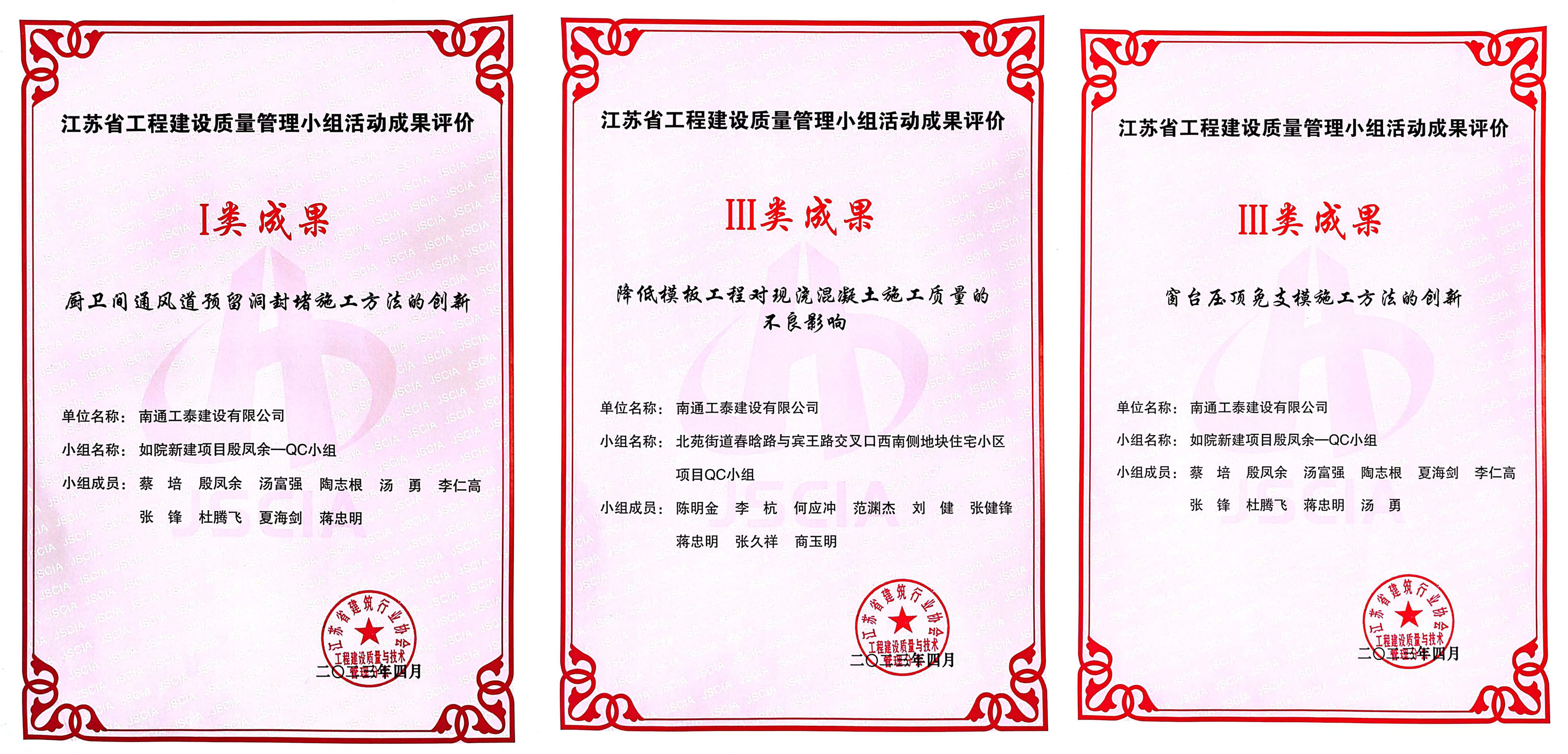 近日,從省建筑行業(yè)協(xié)會工程建設質量與技術管理分會上傳來好消息,南通工泰銀川分公司如院新建項目殷鳳余QC小組的《廚衛(wèi)間通風道預留洞封堵施工方法的創(chuàng)新》、《窗臺壓頂免支模施工方法的創(chuàng)新》、浙江分公司義烏北苑街道春晗路與賓王路交叉口西南側地塊住宅小區(qū)項目QC小組的《降低模板工程隊現(xiàn)澆混凝土施工質量的不良影響》分別榮獲江蘇省工程建設質量成果一類、三類成果。